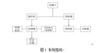 工业机器人是一种拟人态的自动化装置,可以精确的控制物体运动的速度、位置。一般工业机器人可分为操作机、控制器和示教器这三种基本组成。系统组成如图1所示。