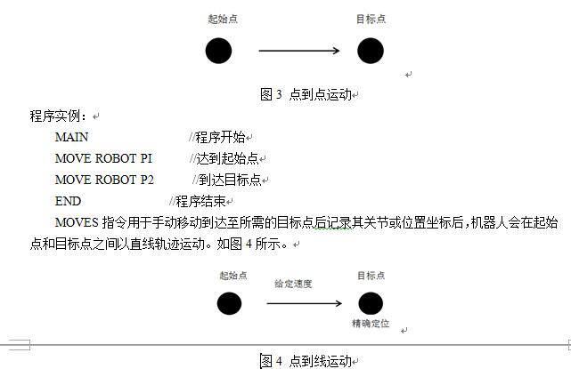 想让机器人根据操作者所规划的运动轨迹自动运行,除了设定添加坐标系还是不够的,还需要有程序的运行,目前最主流的编程方法都是从点位之间的运动轨迹和运动的方式进行编写的,运动轨迹有三种:点到点,点到线,点到圆弧这三个分别以三个运动指令表示:MOVE、MOVES、CIRCLE。