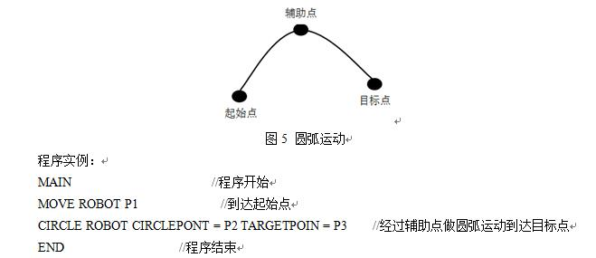 CIRCLE指令为画圆弧指令,机器人画圆弧采用的是任意三点画圆,机器人从当前位置点起选择一过渡点和目标点即可形成一段圆弧如图5所示。当选择圆弧指令后需点击CirclePoint输入框,移动机器人到所需过渡点的位置,再点击记录关节或笛卡尔坐标系,完成CirclePoint记录后再点击TargetPoint,随后以相同的方式进行记录,配置参数后CIRCLE添加完成,该移动方式也可进行精准定位。