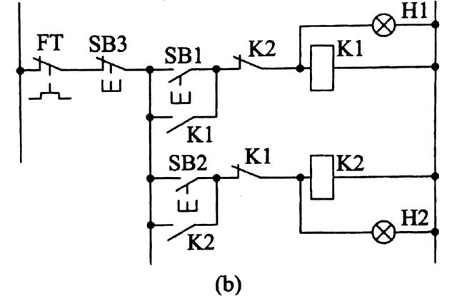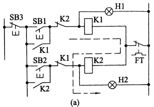 但当热继电器FT动作时,线路就出现了虚线所示的寄生回路,使正向接触器KI不能释放,起不了保护作用。正确的接法应将K1、K2两个线圈接于电源的同端,如图5(b)所示。