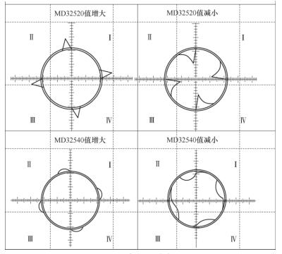 (2)反向跃冲的调整方法 反向跃冲存在的主因是摩擦力状态的改变,所以在出现反向跃冲时,应当给插补轴加上摩擦补偿,在西门子数控系统中,摩擦补偿是由摩擦补偿值MD32520和摩擦补偿时间常数MD32540决定的。对于反向跃冲的调整,首先设置MD32500=1(摩擦补偿有效),再调整跃冲轴对应的摩擦补偿值MD32520和摩擦补偿时间常数MD32540,两个参数值的大小调整对象限点影响可参考图7进行,直到过象限尖点被消除。需要注意的是设置的补偿值不宜过大,当MD32520>150mm/min、MD32540>0.015s时,就应当首先检查机械传动是否良好,速度环增益及积分时间是否合理,过大的静摩擦补偿可能会对表面质量产生负面影响。