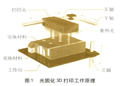 光固化3D打印工作原理与喷墨打印类似,是基于液体喷射原理的RP技术,在数字信号的控制下,喷嘴工作腔内的液体光敏树脂在瞬间形成液滴,在压力作用下以一定的速度与频率从喷嘴喷出到指定的位置,然后通过紫外光对光敏树脂固化,固化后逐层堆积,得到成形零件。成形过程如下:首先根据零件截面的形状,控制打印喷头沿X、Y轴运动,在既定截面的相关实体区域打印实体材料,在支撑区域打印支撑材料,并在紫外光的照射下进行固化,然后打印平台沿Z轴下降一定高度,喷头接着打印固化下一层,如此逐层打印固化直至工件的完成,最后除去工件中的支撑材料即可获得所需的工件。图1为光固化3D打印工作原理图。