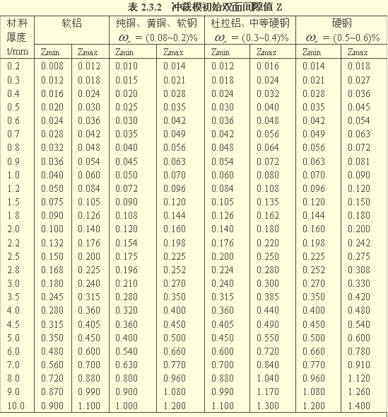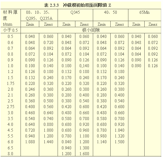 需要指出的是,当模具采用线切割加工,若直接从凹模中制取凸模,此时凸、凹模间隙决定于电极丝直径、放电间隙和研磨量,但其总和不能超过最大单面初始间隙值。(表2.3.2)。可详见GB/T 16743-1997.