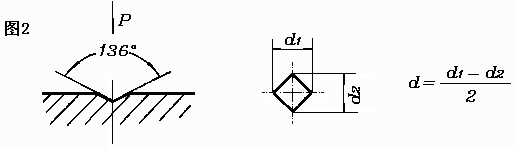 维氏法硬度试验是用相对面间夹角为136°的正四棱形角锥体金刚石压头压入试样,而用压痕面积(mm2)除载荷(kgf)所得的数字表示硬度值,角锥体的压痕面积是根据其两条对角线长度的平均值来计算。硬度值可用下式表示:(参考图2)