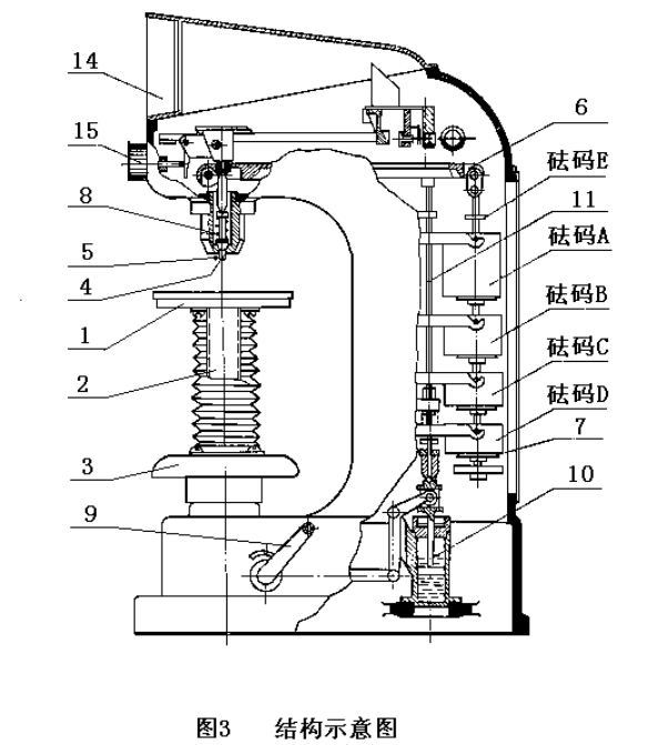 3.在杠杆末端的挂板上挂上砝码台,并将砝码按A、B、C、D顺序由上而下安放在砝码架上,小砝码E放在砝码台的挂钩下(用30kgf即294.2N载荷时将砝码E取出)。