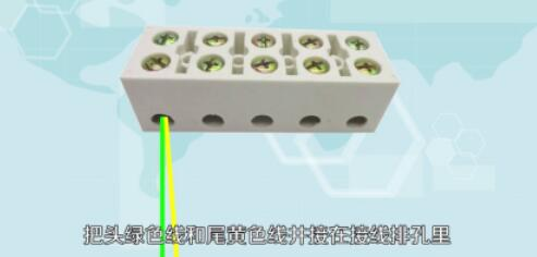 2.开始接线,把头绿色线和尾黄色线并接在接线排孔里。