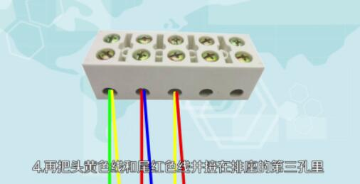 4.再把头黄色线和为红色线并接在排座的第三孔里,以上几步其实就是把三相电机线圈由星型接法改为三角接法,即三组线圈头尾相接组成三角接法。