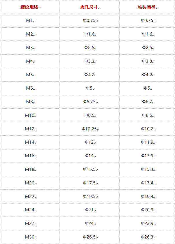 螺纹底孔关系到选钻头的直径,钻小或大都不好,一般情况下底孔直径=螺纹孔的外径-螺距。螺纹规格太多,不同螺纹的规格所钻的底孔不一样,粗牙公制螺纹是机械工业中常用的规格,用得最多。下面是常用粗牙公制螺纹底孔尺寸及所选钻头尺寸对照表:
