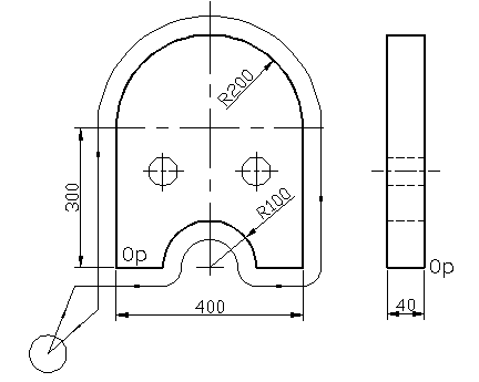 工艺分析:零件厚度为40mm,根据加工要求,每次切削深度为10mm,分4次切削加工,在这两次切深过程中,刀具在XY平面上的运动轨迹完全一致,故把其切削过程编写成子程序,通过主程序两次调用该子程序完成零件的切削加工,中间两孔已加工了工艺孔,设图示零件上表面的左下角为工件坐标系的原点。