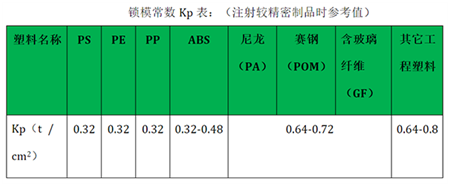 即p=kps 公式中p=锁模力(t);kp=锁模力常数(t/cm2), s=制品在模板上的投影面积(cm2).