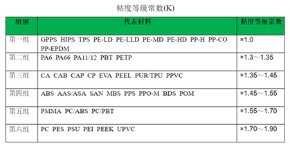 以上各组的塑料都有一个粘度(流动能力)等级。每组塑料的相对粘度等级如下: