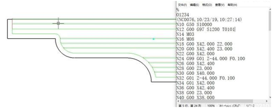 如果选择由机床进行半径补偿,则则生成的程序中的刀尖半径为0,或者说就是按照零件图纸来编写的程序,程序中带有G42G41G40,你还要在机床上进行相关设置,如输入刀尖半径、刀沿、刀尖半径!