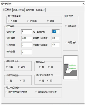 从粗加工参数的对话框中不难看出,加工表面类型是比较好选择确定的,外轮廓内轮廓还是端面,其中内外轮廓的加工角度默认为180°,端面加工时默认-90°或270°。