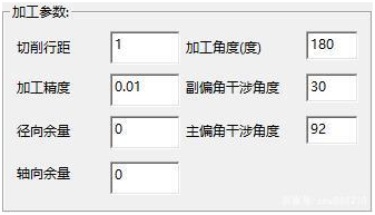 主要设置背吃刀量(切削行距)、精加工的余量(X、Z)、在主副偏角干涉角度的设置上,以前也叫前后角度,要根据工件轮廓的干涉角度来设定同时也要考虑刀具的主副偏角角度设定。可能有人在这块不是太清楚,简单说就是为了避免干涉,刀具的副偏角要大于干涉角,同理,刀具的主后角度要小于干涉主偏角!
