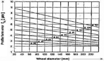 在成型法磨削中, 磨齿机所使用的刀具是砂轮 。砂轮的选用主要取决于齿轮材料的可磨削性及其所要求的表面质量 、修整滚轮和可修整砂轮的耐用度及所要求的磨削功率 。砂轮的材质将影响着砂轮的磨削能力, 也影响着所磨齿轮齿面的表面特性 , 其中齿 面粗糙度大小决定了齿形波纹度的大小从而影响着齿形的形状误差值 。砂轮有两种类型可供选择, 一 种是可修整性砂轮 (Dressable grinding wheels ) , 另一种为非可修整性砂轮 (Non - dressable grinding Wheels ) 。对于加工零件种类较 多, 单号更替频繁的一般选用可修整性砂轮 , 此类砂轮分为白刚玉 ( 氧化铝Al2O3 ) 及陶瓷材质砂轮 , 从经济角度考虑选用氧化铝砂轮较多 。对可修整性砂轮而言 , 一般粗粒度和高孔隙率的砂轮进行粗修整后具有高的磨削能力和大的磨削功率 , 但也将导致大的齿面粗糙度 ;而细粒度和低孔隙率的砂轮经精细修整后将产生高的齿面光洁度, 但同时也降低了最大可能的砂轮磨削功率 。对于可修整性砂轮选用合适粒度(60-80)的砂轮配合合理的砂轮修整参数 , 降低齿面粗糙度 , 能够有效的保证齿形形状误差 。对于一些需要高效率加工且加工零件种类相对固定的可选择使用非可修整性的电镀粘结CBN砂轮 , 用此类型砂轮加工零件的齿形形状误差主要取决于其砂轮本体及涂层的精度, CBN涂层晶体粒度大小(B带数字表示) 以及砂轮直径的大小都直接影响着齿形的形状误差 , 具体关系见图2:
