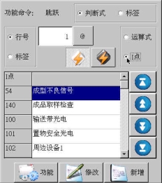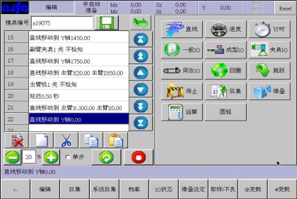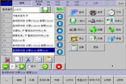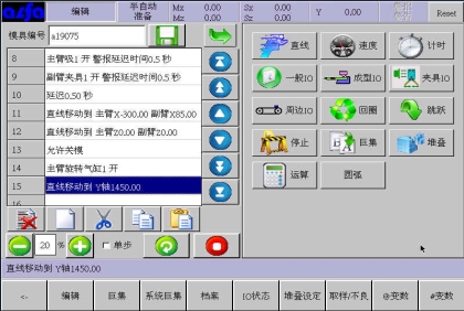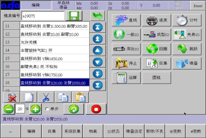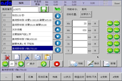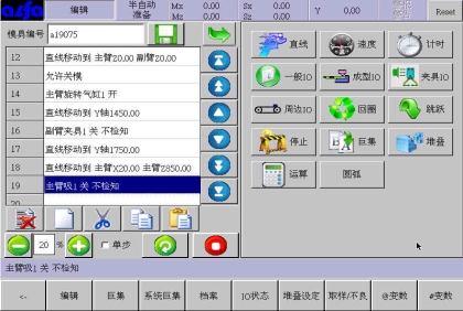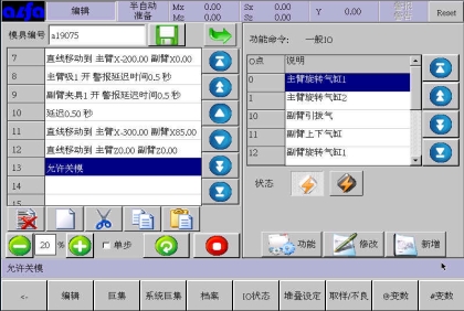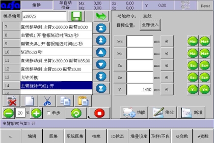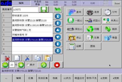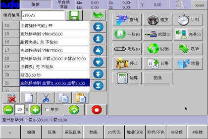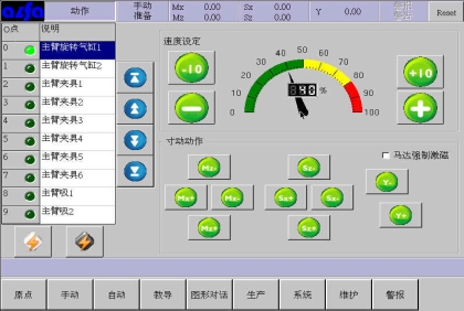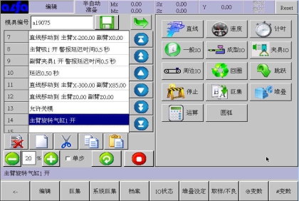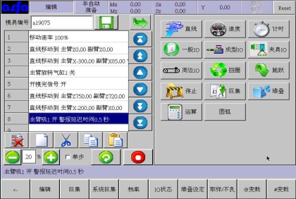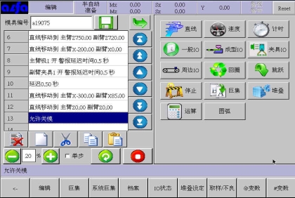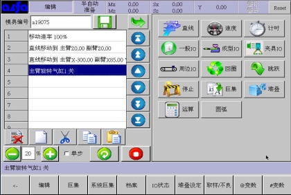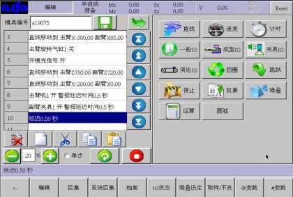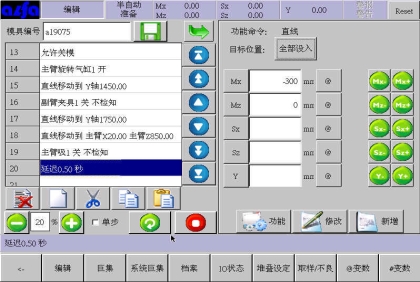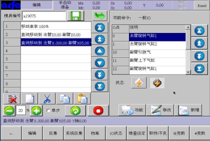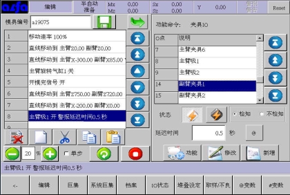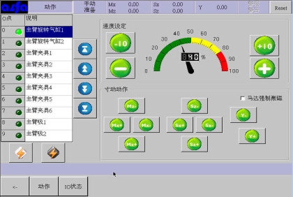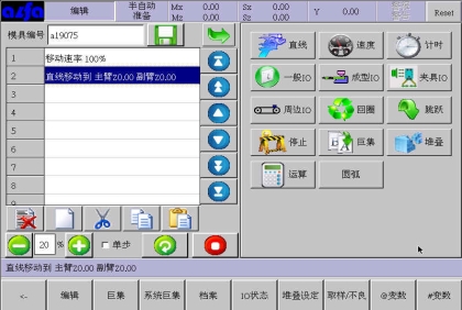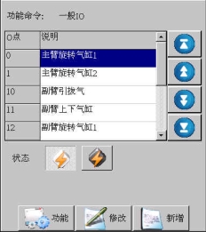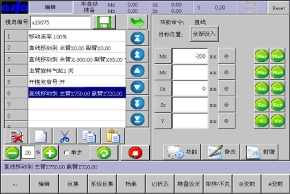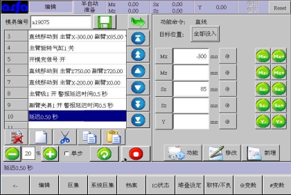 等移动按钮与手动页中的移动按钮功能等同,可以在该画面进行寸动,移动相应轴到目标位置,避免了在该画面需要移动手臂时返回手动画面进行操作的麻烦,按住相应按钮就可以实现,方便了用户编程。
