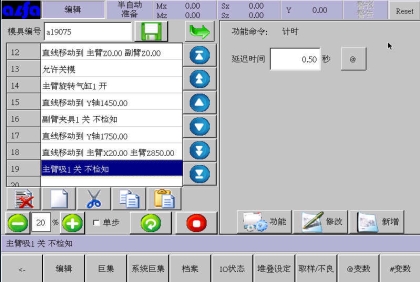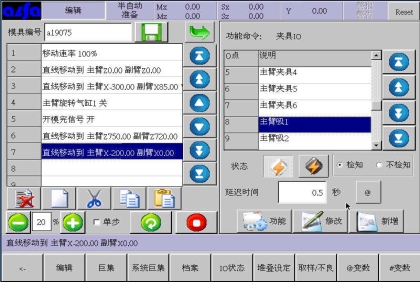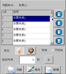 中的延迟时间为报警延迟时间即在有夹或吸动作在所设时间之后如果没有检测到相应的检知信号,就会报警。例如选择主臂吸1ON,检知,0.5秒后如果没有吸检知信号就报警。显示如下图