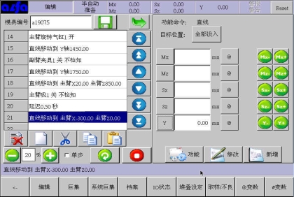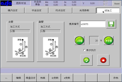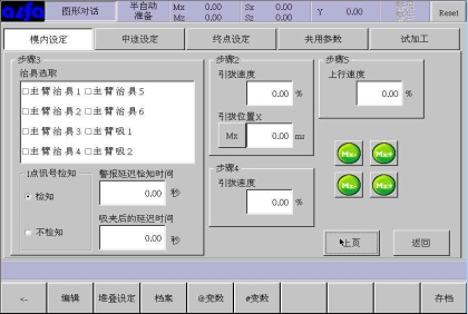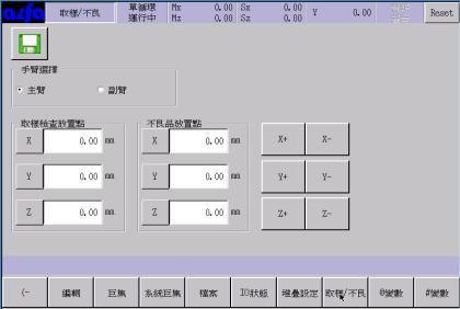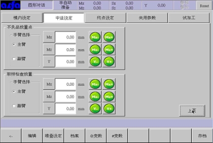 在该页面下选择某个手臂,输入不良品置放位置和取样检查位置或者通过右边的移动按钮调整手臂位置后,点击按钮Mx等将位置设入设定框中。