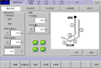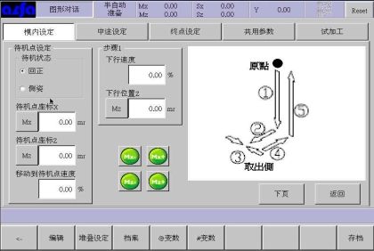 下行位置:手臂下行到模內取物的位置;可以通过该页的移动按钮调整Z轴位置,然后按设定框左边的Mz按钮将位置设入设定框中,也可以直接点击设定框输入坐标位置。