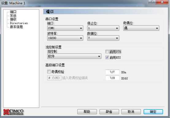 3.按下 RECV 键等待数据传输,在电脑上打开 CIMCOEdit 软件设置波特率如图,发送程序,完成。注意程序首尾需要加“%”号