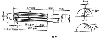 铰刀的结构,一般它由工作部分、颈部及柄部组成。工作部分包括引导锥、切削部、校准部,其中校准部由圆柱与倒锥两部分组成。为了使铰刀易于切入预制孔,在铰刀前端制出引导锥。圆柱部分用来校准孑L的直径尺寸并提高孔的表面质量,以及切削时增强导向作用。倒锥用以减少摩擦。