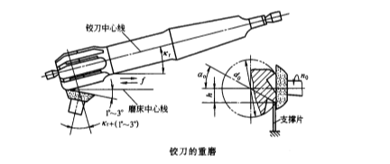 为避免铰刀重磨后的直径减小或校准部分刃带宽度的减小,故一般只磨切削部分的后面。重磨通常在工具磨床上进行,铰刀轴线相对磨床导轨倾斜坼,并使砂轮的端面相对于切削部分后面倾斜1°~3°,以免两者接触面积过大而烧伤刀齿。磨削时,后面与砂轮端面应处于平行位置,前面下的支撑片应比铰刀中心低h,其值为h=dosinαo/2,这样便可得到所要求的后角αo。重磨后的铰刀用油石在切削刃与校准刃的交接处研磨出宽度为0.5~1mm的倒角刀尖,以提高铰削质量和铰刀耐用度。