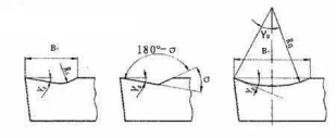 2、直线型断屑槽由两段直线相交而成,其槽底角为180°-σ(σ称为断屑台楔角),槽底角(180°-σ)代替了圆弧Rn 的作用。槽底角小,则切屑的卷曲半径小,切屑变形大;槽底角大,则切屑的卷曲半径大,切屑变形小。在中等切深下,断屑台楔角一般选用60°~70°。