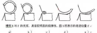 固定不变,断屑槽宽度B 的变化对切屑卷曲和变形的影响。图9a 是槽宽与进给量基本适应,切屑经卷曲变形后碰撞折断成C形;图9b是槽不够宽,切屑卷曲半径小,变形大,碰撞后折断成短C 形或形成崩碎小片;图9c 则是槽太窄了,切屑挤成小卷堵塞在槽中很难流出来,造成憋屑甚至会打坏切削刃;图9d、e则是槽太宽了,切屑卷曲半径太大,变形不够.不易折断.有时甚至不流经槽底而自由形成带状屑。