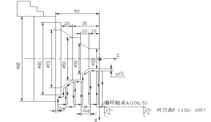 G73 | 仿形复合循环 | 编程格式:G73 U(△i) W(△k) R (d); G73 P(ns) Q(nf) U (△u) W(△w) F S T ; d:表示粗车循环次数(分层数); △i:粗车时, X轴方向需要切除的总余量(退刀量)和方向,半径值。即:毛坯尺寸减去工件最小尺寸除以2。内孔为负值。 △k:粗车时,Z轴方向需要切除的总余量(退刀量)和方向;△k一般情况下都是零。其余同G71指令。 | |||||||||||||||||||||||||||||||||||||||||||||||||||||||||||||