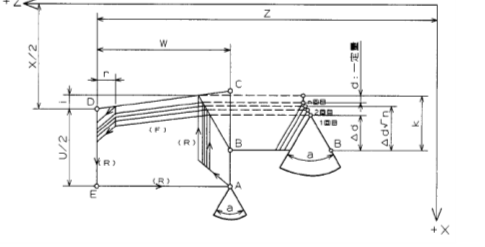 G01 | 倒角或倒圆角指令 | G01 X(U) Z(W) C ; G01 X(U) Z(W) R ; 其中X(U)、Z(W)的值是相邻直线AD和DE的假想交点在工件坐标系中的坐标值, X、Z为绝对坐标值,U、W为增量坐标值。C值是相对于倒角起点的距离。 R值是倒圆角的圆弧半径值。 | |||||||||||||||||||||||||||||||||||||||||||||||||||||||||||||