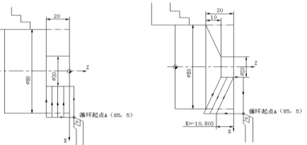 | 端面切削循环 | 指令格式:G94 X(U) Z(W) F ; 锥端面切削指令格式:G94 X(U) Z(W) K F 其中:X、Z—表示切削段的终点绝对坐标值; U、W—表示切削段的终点相对于循环起点的增量坐标值;F—表示进给速度。K—表示切削段起点相对终点的Z方向坐标值之差(通常为负值)即: K=Z起点-Z终点 如G94 X30.0 Z-5.0 F200; G94 X20.0 Z0 K-10.803 F200; | ||||||||||||||||||||||||||||||||||||||||||||||||||||||||||||