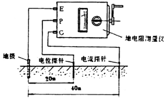 b、在相同直线方向20米、40米潮湿土地处分别插入地位探针及电流探测针,各接于仪器端子P、C上。
