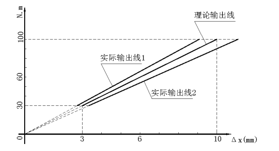 点30Nm合适时(低点可以通过旋进或旋退调整轮达到合适),扳手的实际输出有两种可能,分别为实际输出线1和实际输出线2,即在100Nm要么低于100,如实际输出线1;要么高于100,如实际输出线2。