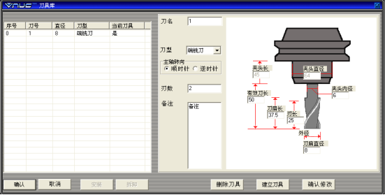 (1)设定刀具(如图10-3所示):输入刀具号→输入刀具名称→可选择端铣刀、球头刀、圆角刀、钻头、镗刀→可定义直径、刀杆长度、转速、进给率→选确定,即可添加到刀具经管库。
