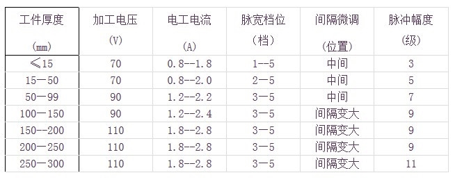 1.工件高度为50mm左右,钼丝直径在0.16mm时,切割加工时,一般置“电压调整”旋钮2档,“脉冲幅度”开关接通1+2+2级,“脉宽选择”旋钮3档,“间隔微调”旋钮中间位置,切割电流稳定在2.0A左右(不同高度工件详见“切割参数选择表”)。