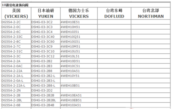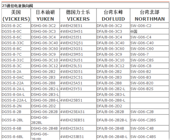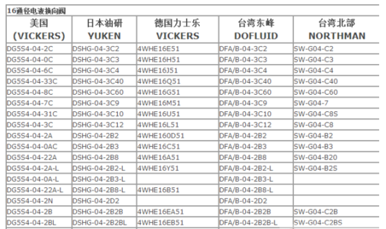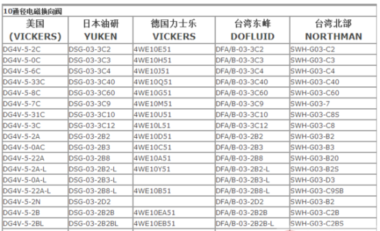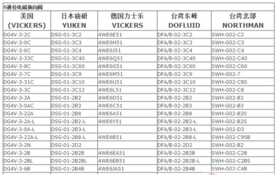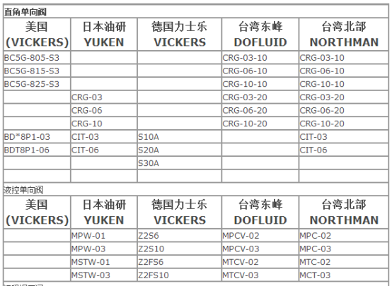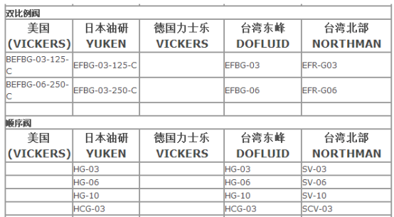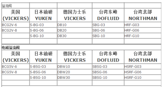 各品牌液压阀的规格型号对照表,如下: