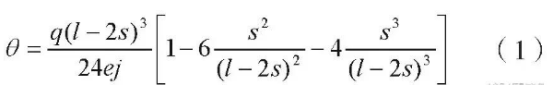 在重力的影响下, 量块会产生垂直于轴线方向的弯曲变形, 这种现象在材料力学中θ称为挠曲, 挠曲状态和水平状态的夹角称为挠角, 其大小可用式 (1) 表示: