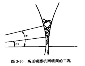 辊压机的工作原理也可如图3-59所示看出。物料由给料装臵(重力或预压螺旋给料机)给入,在相向回转的两个辊子之间受到很高的挤压力而被粉碎。由于在两辊隙之间的压应力达50MPa以上,故大多数被粉碎的物料通过辊隙时被压成了料饼,但饼状物料中含有大量的细粉,经分散后即可选出成品。 物料在磨矿力F的作用下以拉入角(物料拉入处与两辊子中心连线之间的夹角,如图3-60所示o)连续通过间隙最窄的部位:压缩过程中,物料中的空气通过边缘逃逸,物料拉入时的空隙率为40%~50%,处于两辊最小间隙区的物料的空隙率为15%~20%。