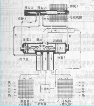 当电磁阀通电时,电磁力吸动控制阀阀芯向右移动,毛细管E与D相连。主阀内右端空间成为低压,高压气体经活塞II的排气孔进入主阀内左端空间,推动阀芯移向右端,管口2与管口3连通而管口4与管口1连通,蒸发器、冷凝器的功能对换,系统转换成制热循环状态。