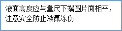 将液氮倒入液氮杯,液面高度应与量尺下端圆片面相平,操作时要小心,不要带棉质等易吸水手套,可带橡胶等拒水手套。液氮罐及液氮杯均应盖好盖儿,以免挥发造成损失和污染。倾倒液氮时,液氮罐口不要压在液氮杯上,以免液氮杯翻到造成危险。装好液氮后,将液氮杯放置仪器托盘上,装好液氮防挥发盖,等待测试。