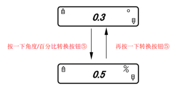 6、 按一下角度/百分比转换按钮⑤,LCD 显示的测量值将在“°”和“%”之间转换。比如: