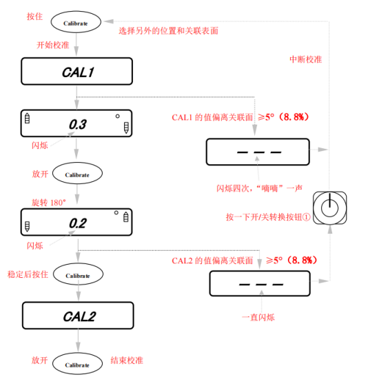 A、 当按校准钮时,不要移动,摇动或晃动电子倾角仪。在水平或垂直的顶部平面,本电子倾角仪也能被校准。但要注意,用于校准的关联表面,必须不能与水平面或垂直面偏离超过 5°;如果在“CAL1”过程中,偏离大于 5°,则 LCD 将闪烁显示“---”四次,“嘀嘀”一声后,倾角仪自动返回测量状态,表明不能在该位置进行正确的校准,应选择另外的位置和关联表面进行校准。
