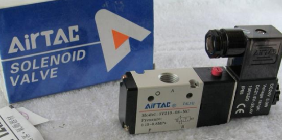 这是亚德客两位三通电磁阀,在其阀体上已有气路图绘制。最显眼的是箭头与“T”,代表什么呢?箭头代表气流方向,T代表截止。除此之外,气动符号还有P、A、R,是来说明电磁阀通路用途。P代表气源进气口、A代表工作口、R代表排气口。由上述简单述说,此两位三通电磁阀在电磁线圈未通电情况下,气源进口处于T标注状况,则说明气源被阻断,此时工作口A与排气口R相通,所以两位三通电磁阀属于常闭型。