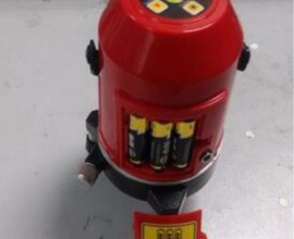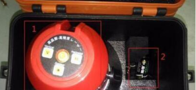1、打开激光投线仪工具箱,取出投线仪主机(红框1)以及3节5号电池(红框2)。取出主机是一定要轻拿轻放,防止破坏激光投线仪的精密度。