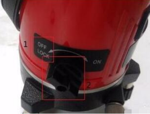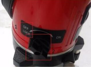 经过对三个支撑脚上的螺母进行顺时针或者逆时针一番调整后,投线仪上方的水平仪完全水平,可以看到气泡已经完全在水平仪正中心(红框)。此时代表:此时此刻在投线仪的固定点,投线仪可以开机工作了。如下图1所示,一般情况下,旋钮开关1(红框2)指向OFF状态(红框1),此时表示是关机关电源状态。为了使用,需要把旋钮顺时针旋转指向ON状态(图2红框1).