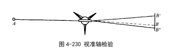 检验:选一长为60~100m的平坦场地,在一端设置一点A,在另一端横置一分划尺B,横尺要大致与BA方向垂直;安置仪器于A、B中间,并使三者的高度接近。用望远镜十字丝中心对准A点,固定照准部及水平度盘(游标经纬仪则固定上下盘),倒转望远镜读出横尺上所截之数设为B'(图4-230)转动照准部180°,重新瞄准A点,再倒转望远镜读出横尺上纵丝所截之数为B',如B'、B'读数相同,则说明视准轴与横轴垂直,否则条件不满足,应进行校正。