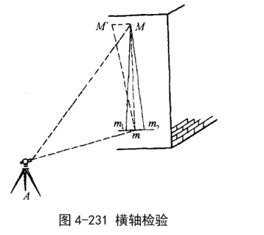 检验:离建筑物10~30m的A点安置仪器(图4-231),在建筑物上固定一横尺,使大致垂直于视平面,并应与仪器高度大约相同。使望远镜向上倾斜30°~40°,用望远镜十字丝的交点照准建筑物高处一固定点M,固定照准部(游标经纬仪则固定上下盘),不使在水平方向转动,将望远镜放平,在横尺上得出读数m1,然后以倒镜位置瞄准M再向下俯视,在横尺上截取数值为m2,如果m1、m2不相同,则证明横轴不垂直于竖轴。