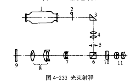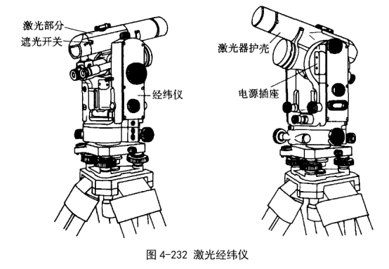 如图4-232是苏州第一光学仪器厂生产的J2-JD型激光经纬仪,它以J2型光学经纬仪为基础,在望远镜上加装一只He-Ne气体激光器而成。由激光器发出的光束,经过一系列棱镜、透镜、光阑进入经纬仪的望远镜中(图4-233),再从望远镜的物镜端射向目标,并在目标处呈一明亮清晰的光斑(图4-234)。