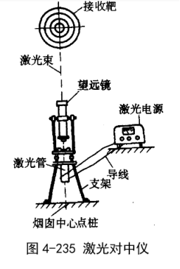 1.高层建筑及烟囱、塔架等高耸构筑物施工中的垂度观测和准直定位。如某公司在某电厂180m钢筋混凝土烟囱滑模施工中,与天津大学协作,用一台KASSEL型经纬仪,加装一个氦-氖激光管,制成激光对中仪(图4-235)。仪器置于地下室烟囱中心点上,将激光的阴极对准中心点,调整经纬仪水准管,使气泡居中,严格整平后,进行望远镜调焦,使光斑直径最小,这时仪器射出的激光束,反应在平台接收靶上,即可测出烟囱的中心。由于使用激光对中仪对中,比用传统的垂球对中节约时间,提高了精度,并可随时检查筒身中心线,便于及时纠偏。使用结果,180m高的烟囱,滑升到顶时,中心偏差只有1.2cm,为国家规范允许偏差18cm的1/15。