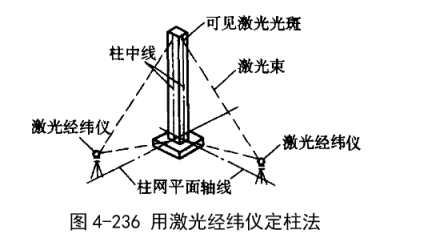 2.结构构件及机具安装的精密测平和垂直度控制测量。如图4-236所示,用两台激光经纬仪置于柱基互相垂直的两条轴线上,在场地狭小的情况下,可以比一般经纬仪更靠近柱子。安置、对中、整平等手续同一般经纬仪。转动望远镜,打开遮光开关,发射激光束,使光斑沿柱的平面轴线扫描到柱脚,校正柱脚位置后缓缓仰视柱顶,如柱的轴线与光斑偏离(人人都可看到),可立即进行校正,使两台激光经纬仪发射的光斑都正对柱的轴线,即为柱的正确位置。